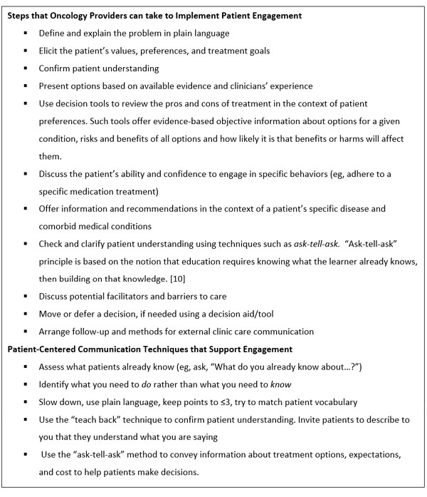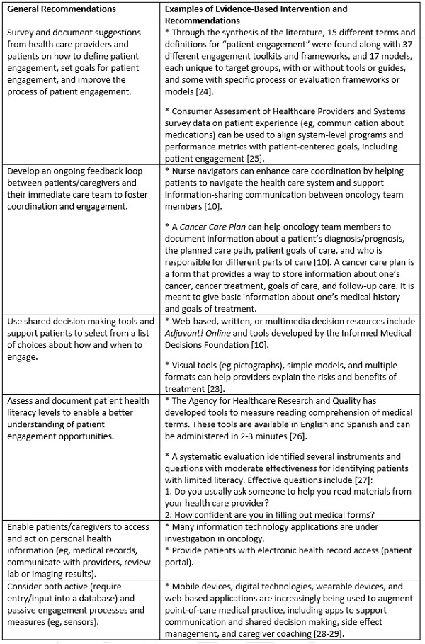 At the system level, effective engagement interventions for patients with low health literacy include offering educational materials that adhere to best practices with regard to health literacy. Strategies for facilitating understanding include using large font, short sentences written in plain language, pictures, clear headings, and text written at a fifth-grade level. System level literacy support for patient engagement also includes using clinical information systems to provide real-time reminders during patient visits, [22] reduce patient burden by eliminating redundancy, and implementing medication reconciliation strategies (eg, simplifying medication regimens, using pill-boxes or other medication organizers, creating clear instructions about medications by using consistent pharmacy codes for order entry). [23] Table 2 summarizes roundtable recommendations for implementing patient engagement in oncology that are also supported in the literature.