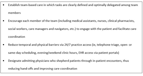 Innovative patient care models in oncology based on patient-centered medical home (PCMH) principles are now showing evidence of effectiveness. For instance, a recent review concluded that the oncology PCMH can significantly reduce emergency room visits, hospital admissions, and overall costs among patients being treated with chemotherapy. [30] The essential feature of the PCMH model is to retain the primacy of an ongoing relationship between patients and their health care providers which may be extended beyond the core team and include nurses, social workers, dieticians and clinical support staff, with whom both the patient and oncologist have an ongoing relationship. Moreover, the PCMH approach is proactive in rigorously assessing for, and addressing health risk factors, and in removing barriers (eg, communication, physical, temporal, financial) between the patient and health care team (Table 3). [31]