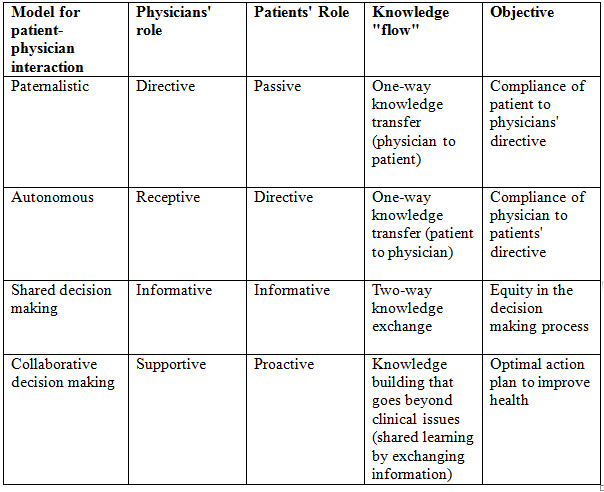 Perhaps the most important impediment to shared decision making is the time constraint faced by health professionals in most busy clinical settings.[11] Unfortunately, not many clinical environments are conducive to informing patients in a manner that is timely, unhurried, easily understood, and jargon-free. Very few clinicians are equipped with the skills or tools necessary to encourage people to consider outcomes, ask questions, clarify values, and to express preferences about diagnostic or treatment options within normal consultation times.[12] Instead, most of the consultation time tends to be spent defining the problem rather than suggesting treatment options[13], thereby hindering the capacity for shared decision making. Moreover, patients might change their preferred decision making mode over the natural history of major diseases, [14] matching the fluctuating degrees of seriousness of their conditions.[15] Collaboration between patients and clinicians may be a more appropriate and feasible objective than shared decision making. Table 1 illustrates these decision making models.