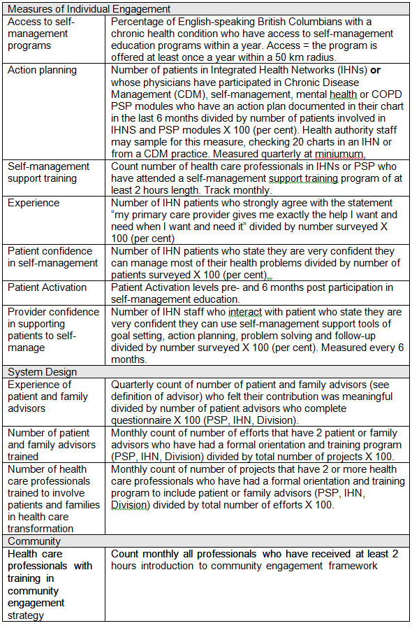 The application of Patients as Partners principles is evolving in BC. While the culture is shifting to value patient experience and personal involvement in health care, practical methods and measurements are slow to develop. The Patients as Partners Advisory Committee has developed a provincial measurement strategy that includes a variety of instruments to gauge individual and community engagement and elements of system design (see Table 1).
