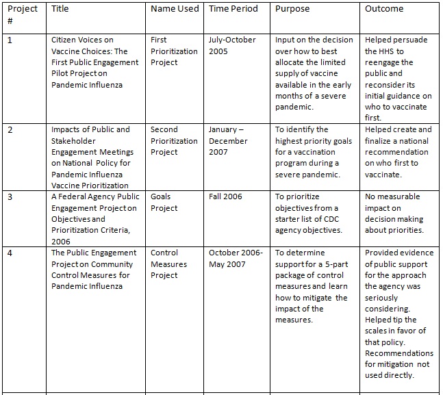 Beginning in 2005, the DPET model or modified versions of it have been used in nine public engagement projects that have been initiated by CDC and/or the National Vaccine Program Office at the Department of Health and Human Services, the parent Department for the CDC. One of these nine projects was a grant program to six state health departments to assess the feasibility of the DPET model at the local level. A brief description of the nine projects is included in Table 1 of this paper and case abstracts for each project are presented in a companion paper in the Journal.[1] In addition, a third paper describing a proposed participatory evaluation framework by the researchers who evaluated the state and local DPET projects has also been recently published in this Journal. [4] The purpose of this paper is to provide an overview of all the projects and to identify key lessons learned that might provide useful guidance for researchers and practitioners seeking to improve the quality of public engagement projects.