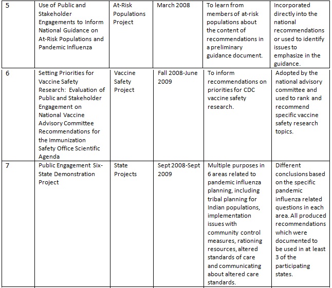 These projects were implemented under the sponsorship of the Centers for Disease Control and Prevention (CDC), the Department of Health and Human Services (HHS), or the Association of State and Territorial Health Officials (ASTHO). They were guided by a set of principles culled from best practices in the field and well-aligned with the 2008 broadly-applicable findings on public participation by the National Research Council of the National Academies.