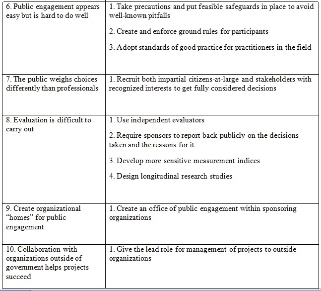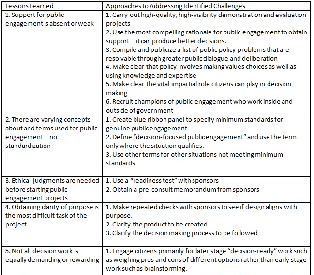 Taken as a whole, the projects provided further “proof of principle” that engaging the public in participatory policy-making sponsored by governmental agencies is not only possible but can be influential in shaping decisions. A companion paper in this Journal provides detailed case abstracts for each project and an overall summary and discussion. [1] This report describes ten lessons learned from conducting these projects.
