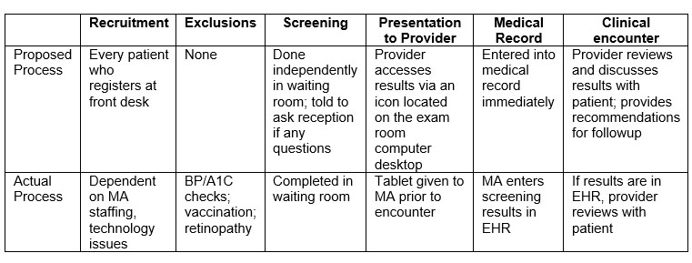 Table 3 presents the contrast between the proposed and actual screening processes. Over the course of 32 screening days of the intervention, 146 patients (46.5%) out of 314 eligible patients (according to criteria outlined above) completed the screening, and were compared to a control group of 129 patients seen in the clinic prior to the intervention. Patients reported that the tablets were easy to use and that they felt the information would be useful in their health care. A quarter of the patients struggled with the technological aspects of the tablet and required assistance, while only three patients refused to participate.