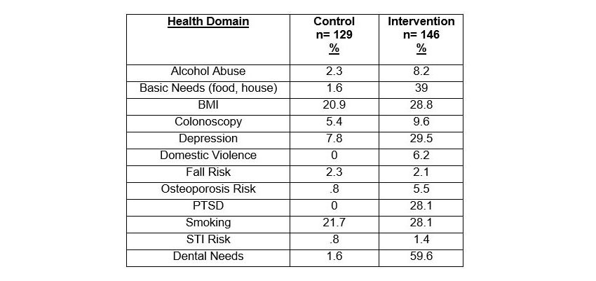 For health domains in which validated measures were not available (eg, dental health and basic needs), focus groups of professionals and experts were consulted to generate three questions each that would be indicative of the need for care. For the control group, outcomes were determined through review of EHR on the target appointment. For example, the presence or absence of the medical issue in the target appointment was determined based on the problem list and clinical notes sections of the patient’s paper medical record or EHR. If a patient had been identified as depressed during the target appointment, this was indicated as a positive indication of depression in the chart review.