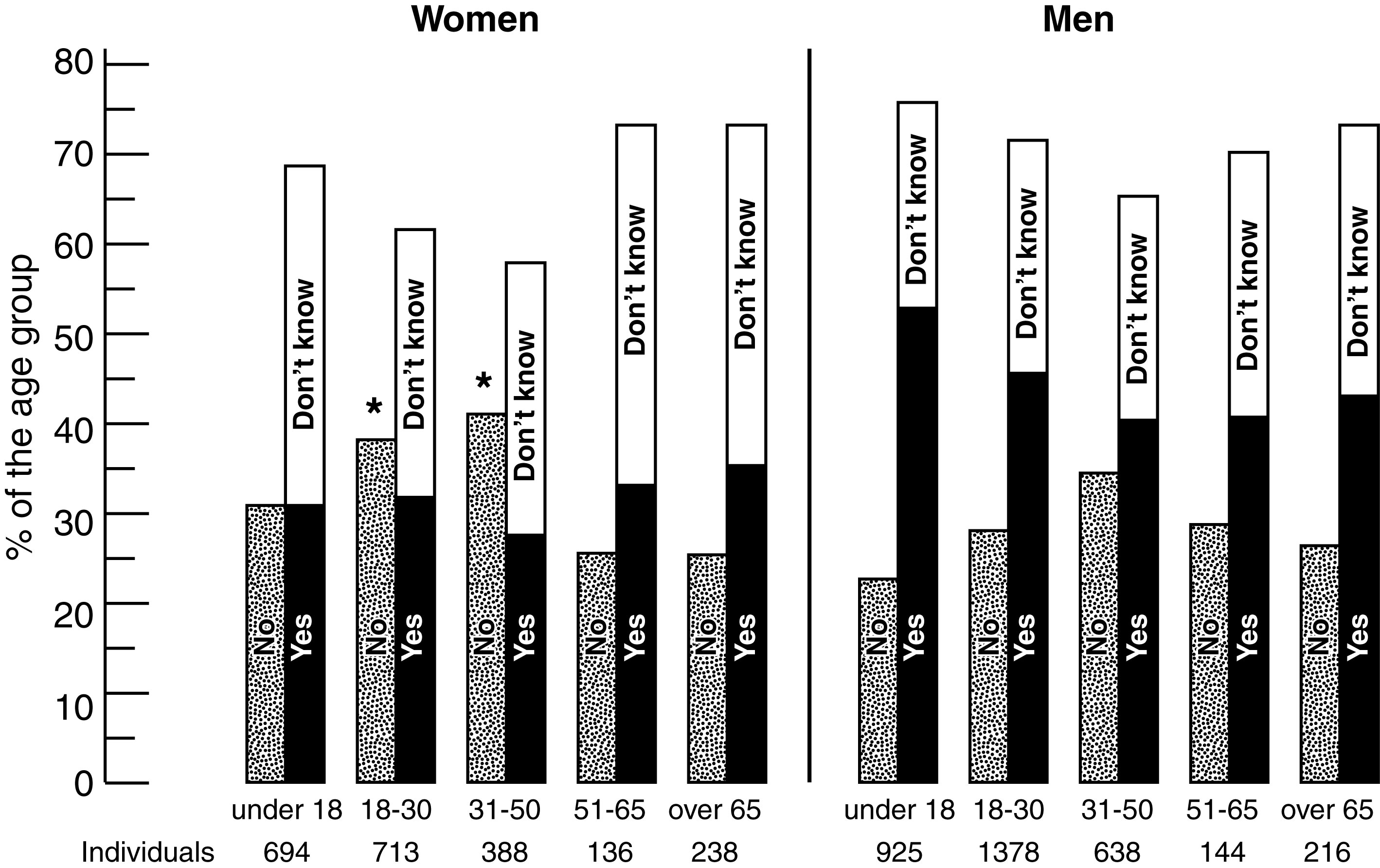 Furthermore, the data in Figure 1 show that (for all ages) 44.9 ± 4.98% (mean ± SE) of the men replied “yes”, in contrast to 32 ± 2.96% of the women, a difference that was significant at a level of P = 0.0011 (student’s t).