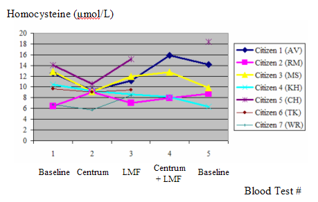 While a homocysteine range of 0.0-15.0 µmol/L is considered clinically normal, many scientists contend that lower levels are preferable. Suggested preferred levels are less than 11.4 µmol/L for men and less than 10.4 µmol/L for women in one paper cited.[26] According to these measures, four out of the seven pilot participants had high baseline homocysteine levels which they were able to meaningfully reduce with supplement interventions.