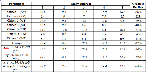 Phenotype results: Figure 2 and Table 2 illustrate how homocysteine levels shifted during the pilot study. Table 3 contains the blood test data for vitamin B-12. At baseline, homocysteine levels ranged from 6.4 – 14.1 µmol/L. The cohort mean was 10.4 (SD (standard deviation) 3.03), and was higher for vegan/vegetarian individuals with a polymorphism in rs1801133 (12.8 versus 9.5). After the first intervention (Centrum multivitamin), homocysteine went down for six individuals and up for one individual, and had a tighter range (5.7-10.6; mean 8.8; SD 1.50).