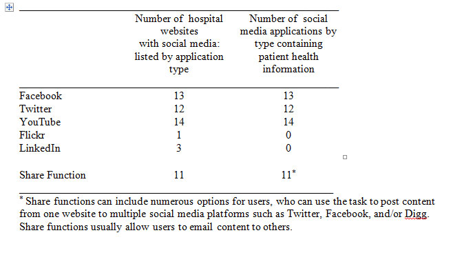 Social media applications connect one group of people to another. More importantly, social media applications enable hospitals to target e-patients with health communication messages. Table 1 illustrates that the vast majority of top-ranked hospitals use Facebook, hospital sponsored YouTube videos, and Twitter to communicate with e-patients.