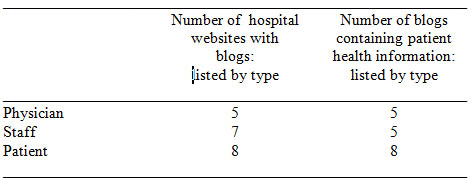 Blogs are a web-based, text-heavy format. Typical blog content on the websites studied contained health communication messages from medical experts and personal stories from patients (see Table 2). Physicians provided specialty medical information and advice through blogging in five of the hospital websites reviewed. Allied health professionals, such as nutritionists, wrote blogs about health information for hospital audiences. In both physician and allied health professional blogs, comment functions were available for e-patients. Depending on the topic, e-patients would engage each other through the blog. Very little additional engagement was noted between e-patients and blogging health providers.