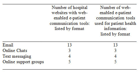 Web-enabled communication tools allow two-way communication between hospital health care providers and e-patients. E-patient web-enabled communication tools identified in this study included email, online chat, and text messaging, and online support groups. The occurrences are reported in Table 4. A standard email link to contact the hospital was available on the majority of hospital websites. Only the University of Washington Medical Center-Seattle website required that contact with the hospital occur via phone. More innovative web-enabled communication tools were found in online chat forums. For example, the Cleveland Clinic’s online health library offered e-patients an opportunity to chat with a health care provider to aid their search. The hospital also offered the ability to submit a question online throughout their site.