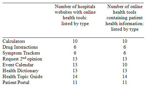 The most interactive and personalized online tool available on hospital websites was the patient portal to access information from a hospital’s electronic health records. Patient portals are individualized, password protected accounts for which a patient must register. Unlike general health tools on hospital websites, a patient portal contains personal health information, which must be protected under healthcare privacy laws. Since privacy prevents direct examination of a patient’s portal web content, this research relied on hospital descriptions of their patient portal functions.