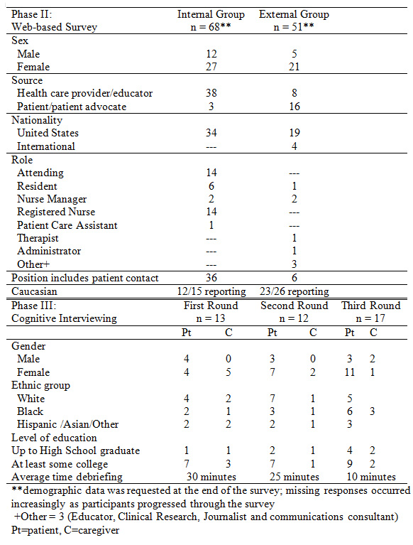 Methods: The authors conducted a three-phased mixed methods study for development of survey items over the period of March 2012 to August 2012. Our review of survey items included assessing feasibility, usability, and response process through (1) initial review of potential items, (2) a web-based questionnaire for health care providers and patient advocates, and (3) cognitive interviewing with patients.