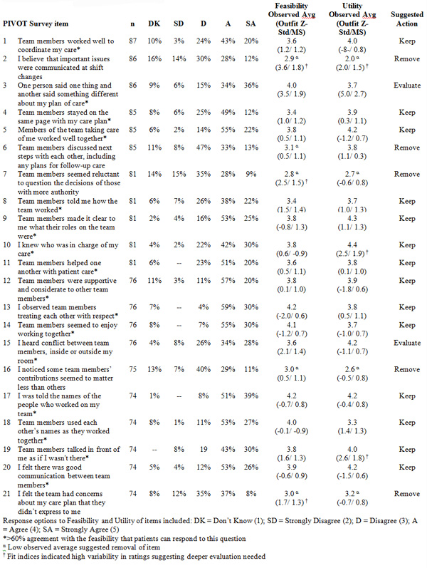 Of the items participants rated as not feasible to ask patients, three had reasonable fit values, suggesting these three particular items should be removed from the PIVOT survey. These were items #6, #16, and #21. However, two remaining problematic items and an additional item had elevated fit indices suggesting that there was less rater consistency in these items’ feasibility ratings. These three items required deeper evaluation: items #2, #7, and #15. Although the remaining 16 items had observed averages over 3.5, two items showed high fit indices that suggested a lack of agreement in participants’ ratings. Two items below had outfit Z-Standardized values of 3.5 and 2.1, respectively, indicating deeper evaluation was required: items #3 and #15.