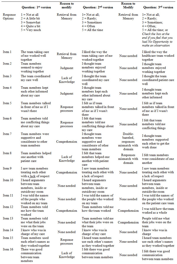 Through analysis of responses to the proposed questionnaire items on patient perception of health care teamwork, a consensus emerged about which items provided the most clarity, relevance, and utility for improving team effectiveness. Resulting wording changes provided the survey format for cognitive interviewing to further clarify the wording and response options. The changes made from the web-based survey version improved the “plain language” of the questions and reduced the SMOG readability consensus for all question items from an initial reading level of 6th grade to a 5th grade level using the McLaughlin calculator.