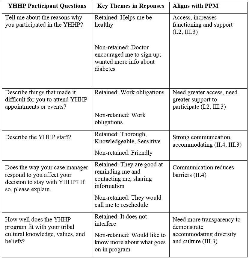 Through focus groups, we were particularly interested in learning about factors within YHHP that served to empower the AI participants, the processes that facilitate bi-directional engagement between patients and providers, and how these attributes create a more effective indigenous-focused participatory medical model. We sought to identify the parameters of participatory medicine which were particularly helpful in fostering patient success in YHHP (see Table 1).