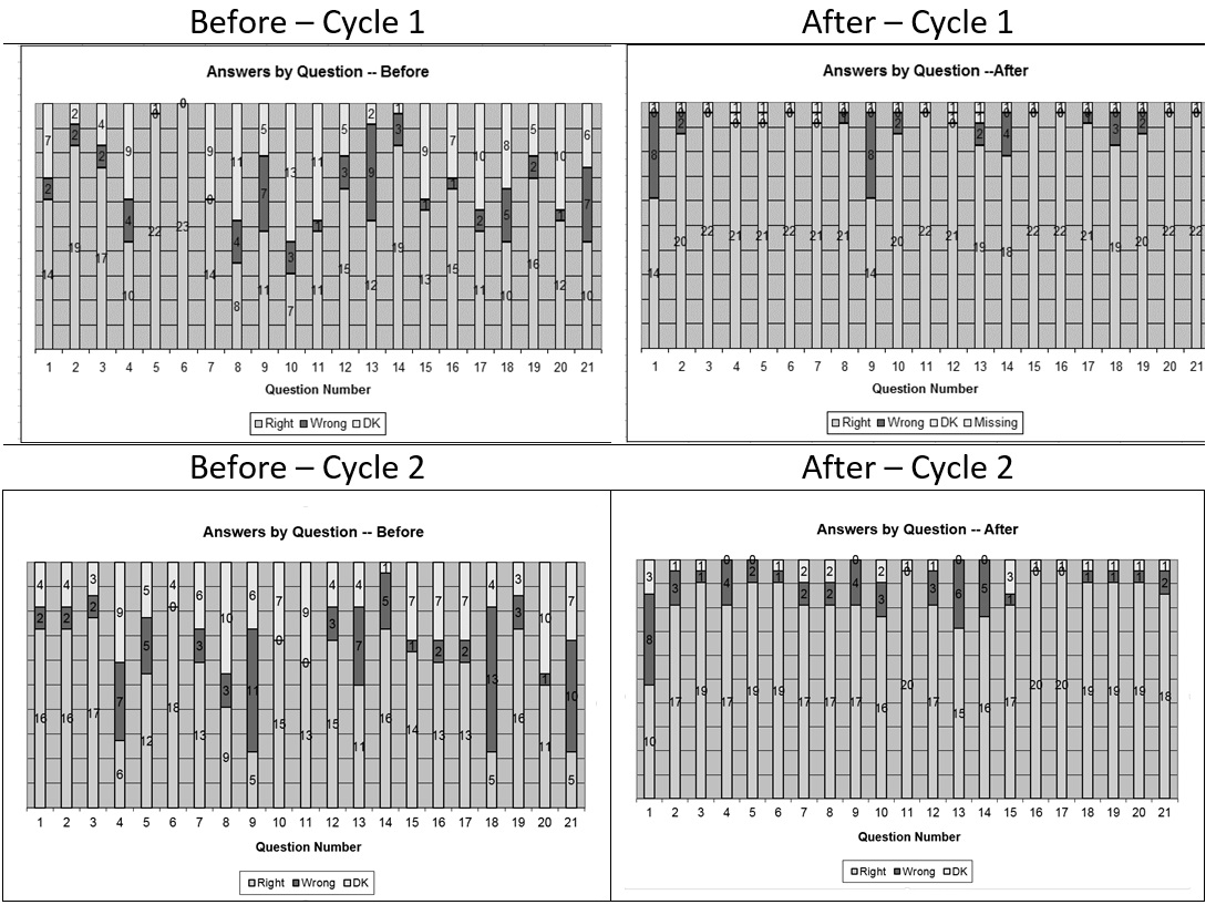 We examined the changes in knowledge on 21 key prenatal health messages before and after the seven sessions. The results by questions for each cycle are shown in Figure 1. The participants demonstrated a statistically significant increase in knowledge after attending the program (P < .001).