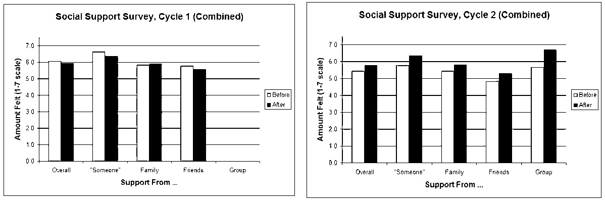The Social Support Survey results, shown in Figure 2, showed no significant change in perceived support from family, friends, or a ‘special someone.’ In Cycle 2, we added ‘group members’ to this list. Participants indicated at the end of the program that they experienced a high level of support from their group peers.