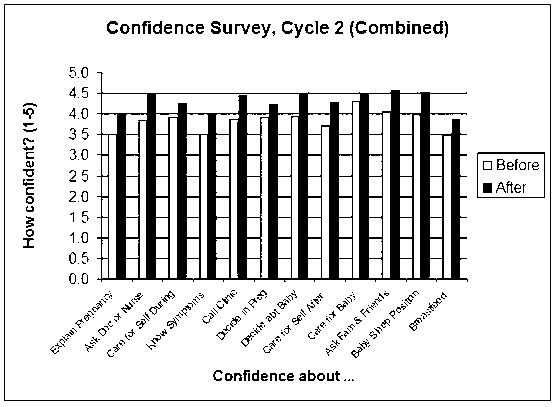 The results of the Confidence Survey, developed for Cycle 2, are presented in Figure 3. Participants, on average, had more confidence after the program than before about all 12 actions related to pregnancy and childbirth. The difference is statistically significant (P ≤ .05). The largest increases in confidence occurred with items about asking the doctor or nurse questions, calling the clinic, asking family and friends for help, and putting the baby in a safe sleep position.