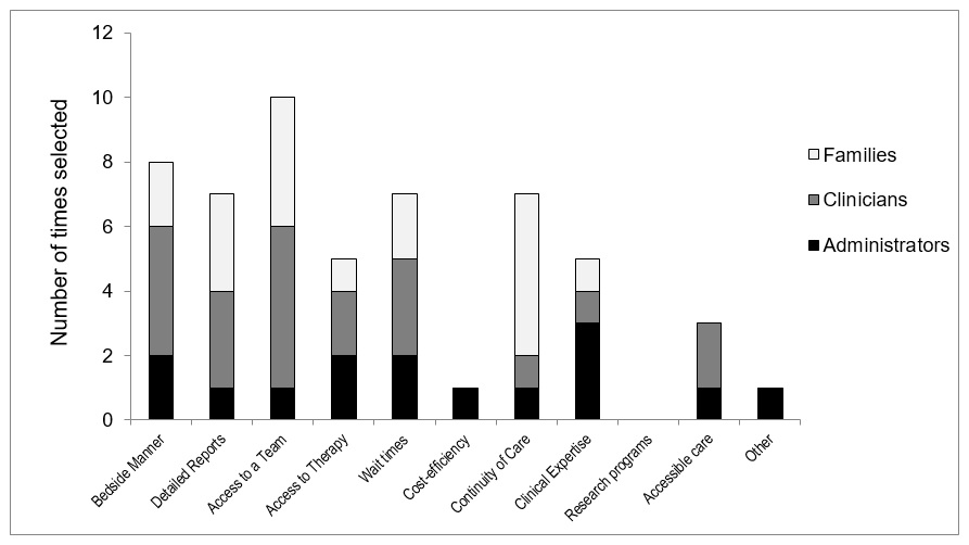 Results from the itemized survey are displayed in the figure. In summary, the distribution of items selected was in keeping with the themes reported via the semi-structured interviews. Looking at individual stakeholder groups, administrator responses were more heterogeneous across domains, while clinicians emphasized the importance of access to a team, and good bedside manner. Families, on the other hand, identified continuity of care with the same provider as being of high importance, much more so than other stakeholder groups and items.