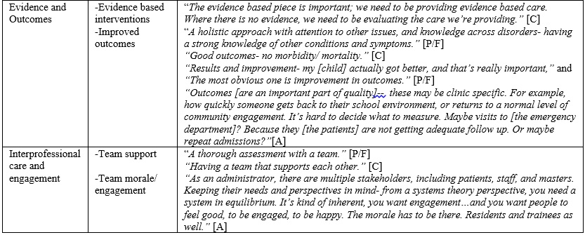 Results: Four main themes were identified: 1) communication; 2) access to care; 3) evidence and outcomes; and 4) interprofessional care and engagement. Potential quality indicators of relevance in outpatient child and adolescent mental health care are outlined.