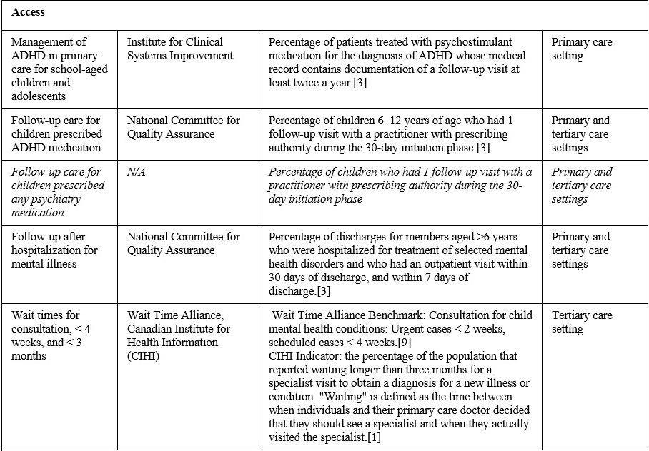 The identified child and adolescent mental health care indicators, mapped to the core themes, are summarized in Table 2. A few additional indicators were proposed by the authors and added to this list (specifically, time to completion of written reports, family and patient satisfaction surveys, and staff engagement surveys), given their relevance to tertiary care, the themes identified, and our particular site. A further indicator (follow-up care for children prescribed ADHD medication within 30 days) was adapted, to include any psychotropic medication.