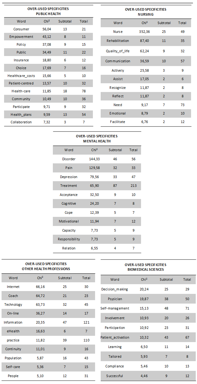 Specificity Analysis on the “Field of inquiry” sub-corpora revealed the following specificities: