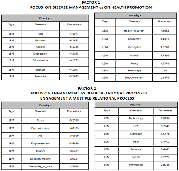 The tables list the thematic specificities of the factors that explain variance between elementary contexts (EC). The factors are interpreted on the basis of the threshold values of their constitutive elements (ie the words that are “more typical”/ “concentrated” at each pole of the axes). (p<.05)