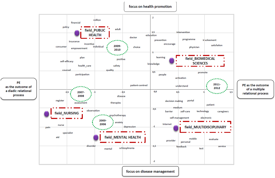 In the upper left quadrant of the map, academic contributions from 2009 to 2010 are located. These mainly refer to patient engagement as a result of an effective relationship between citizens and the health care system aimed at promoting health and disease prevention and saving health care costs. In this perspective, patients can play a distinct role in protecting their health, choosing appropriate treatments for episodes of disease management. In this period, research about patient engagement seemed to show that it could improve patient experience and also be effective clinically and economically. In the upper right quadrant of the map, academic production from 2011 to 2012 is clustered. Contributions in this area belong primarily to medical sciences and mainly describe patient engagement as a result of a multi-level relationship between citizens and the health care system (ie, doctors, health care organizations; health care policies) featuring individuals’ participation in health promotion s. This perspective seems to focus specifically on providing health information to patients and the public and on the role of health literacy in fostering patient engagement.