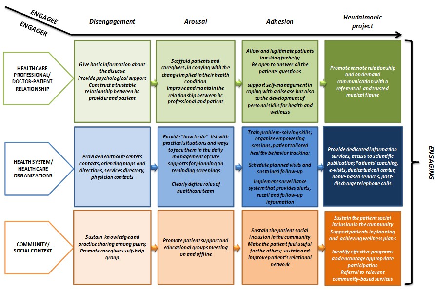 In our view, a wider and more comprehensive modelling of patient engagement should take into account the roles, features and evolving characteristics in time of all the pivotal elements in the process, such as the engagers (ie health care professionals, organizations, communities…) as well as of engagees (ie, the patients, their caregivers…) and of engaging elements (ie, devices, interventions, tools…). This perspective towards engagement may help policy makers in setting research and funding agendas that can really improve the quality, relevance, ethical dimensions and implementation of the research conducted and ensure that research resources address the issues which are most important to patients affected by health care problems.[37][38] Furthermore, this approach can help in drafting guidelines for planning interventions able to foster patient engagement in a way that is really fine-tuned with the specific phase of the patient’s experience (Figure 5). It may contribute to understanding the real value of patients being involved in the care process according to a patient-centred approach. [39]