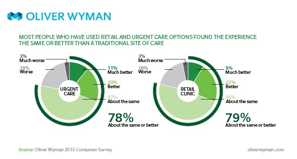 A study conducted in late 2015 by Oliver Wyman, an international consulting firm, that included 2,000 adults from diverse age, income, race and demographic backgrounds, revealed that nearly 80% of respondents liked their visit to the retail or urgent care clinic better or the same as their visit with their primary care physician. This is in sharp contrast to a similar study Oliver Wyman conducted in 2013 when only 15% of respondents had used a retail clinic and one third of the respondents were not even familiar with the concept.