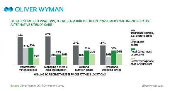 Graegar Smith, Principal at Oliver Wyman Health and Life Sciences Practice and the lead author of this study predicts “in the future we will see a lot of change and evolution as health care payers refine alternative sites of care strategies and as consumers become more open to finding care in locations that include grocery stores and mass retailers.