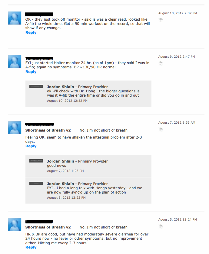 Figure 1: A series of screenshots showing brief feedback interchanges between a physician and patient using HealthLoop.