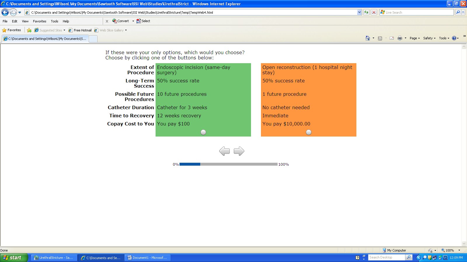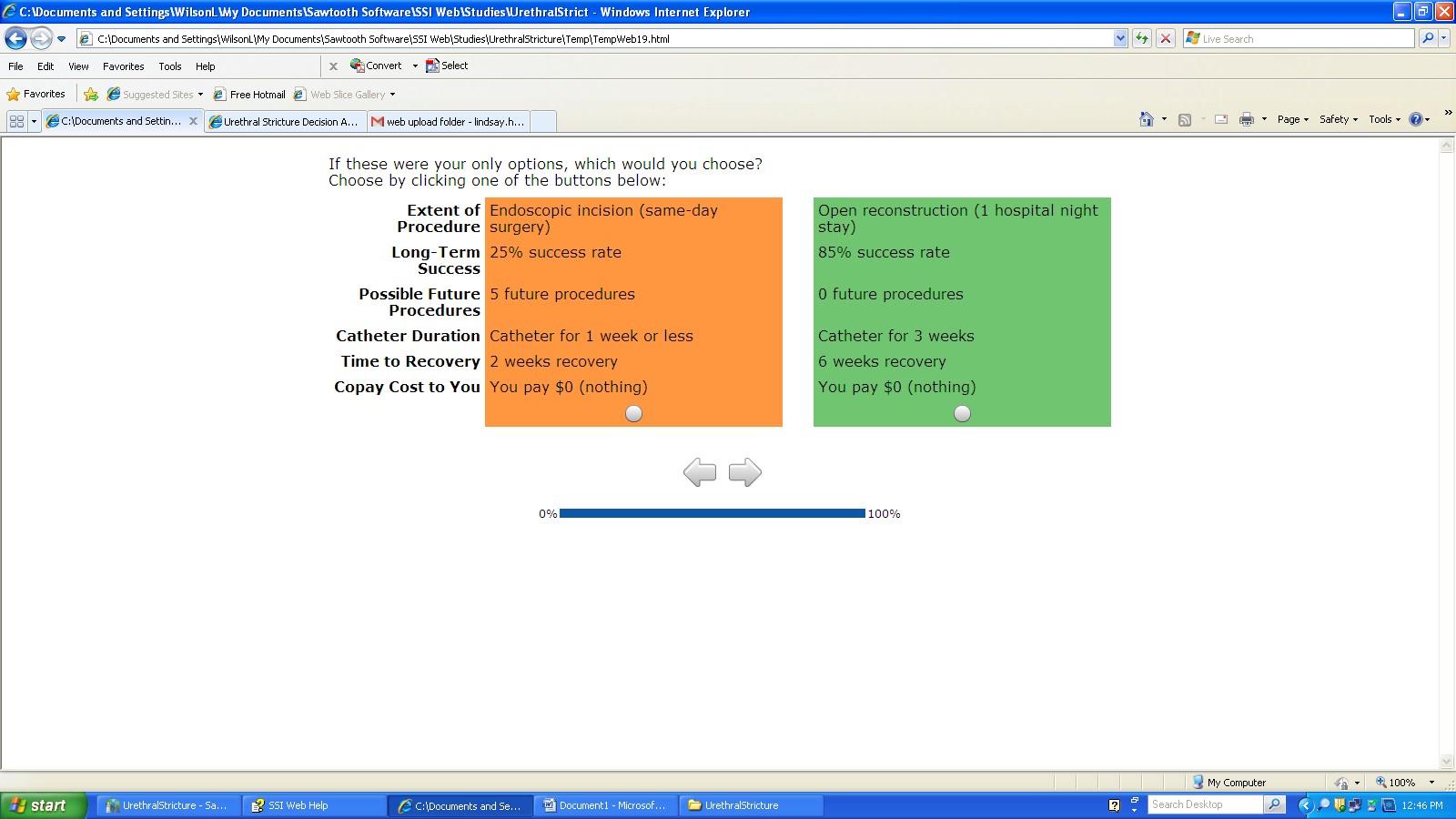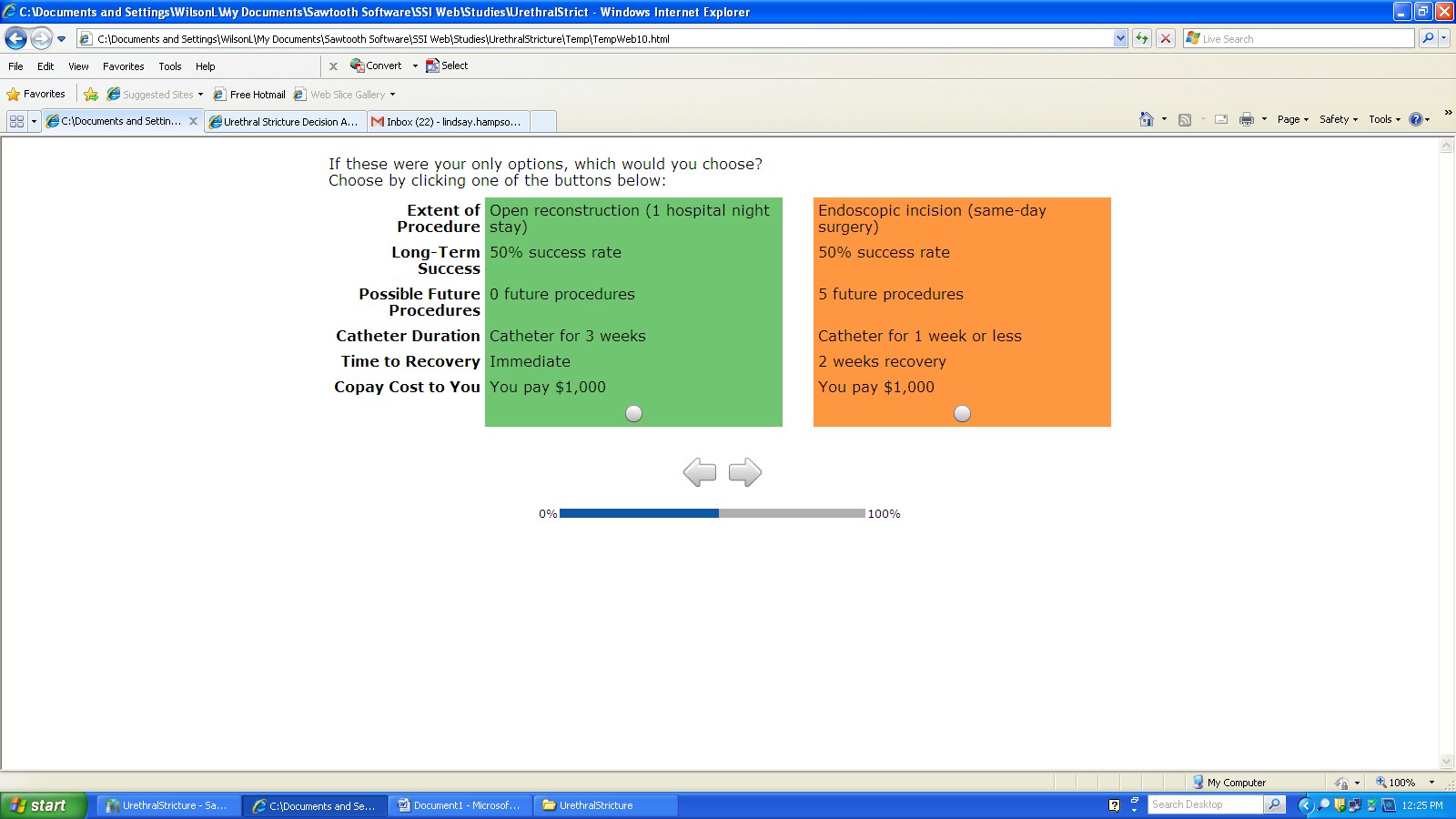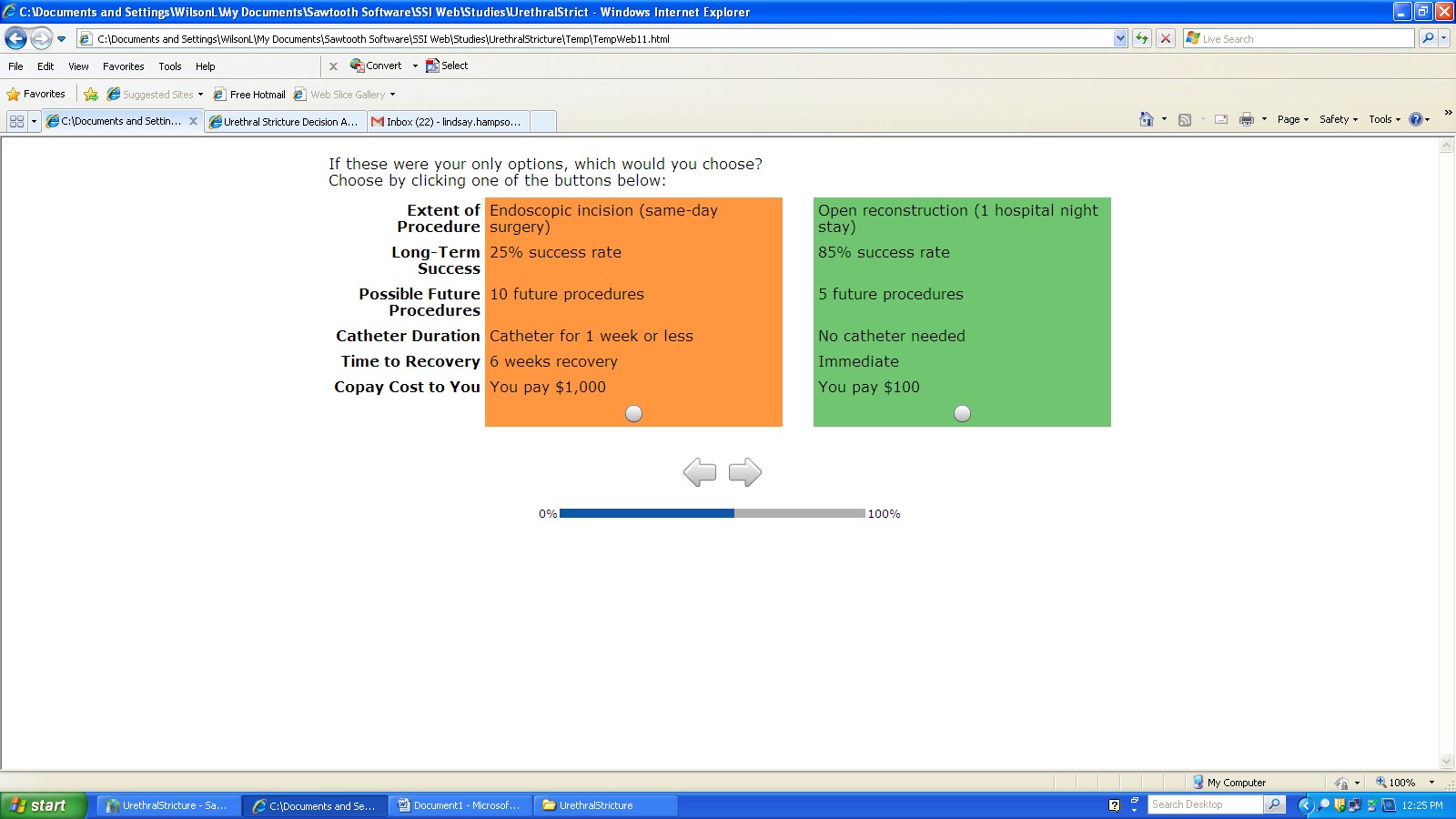 The experimental design of this study employs a series of tradeoff questions to generate preference information. The attributes and levels included in the tradeoff questions are determined through a three-step process, including first a review of the literature on risks and benefits of the urethral treatments; second, discussions with and evaluations of the initial attributes with clinicians who provide urethral treatments and a few patients; and third, a qualitative interview process with patients with urethral stricture disease.